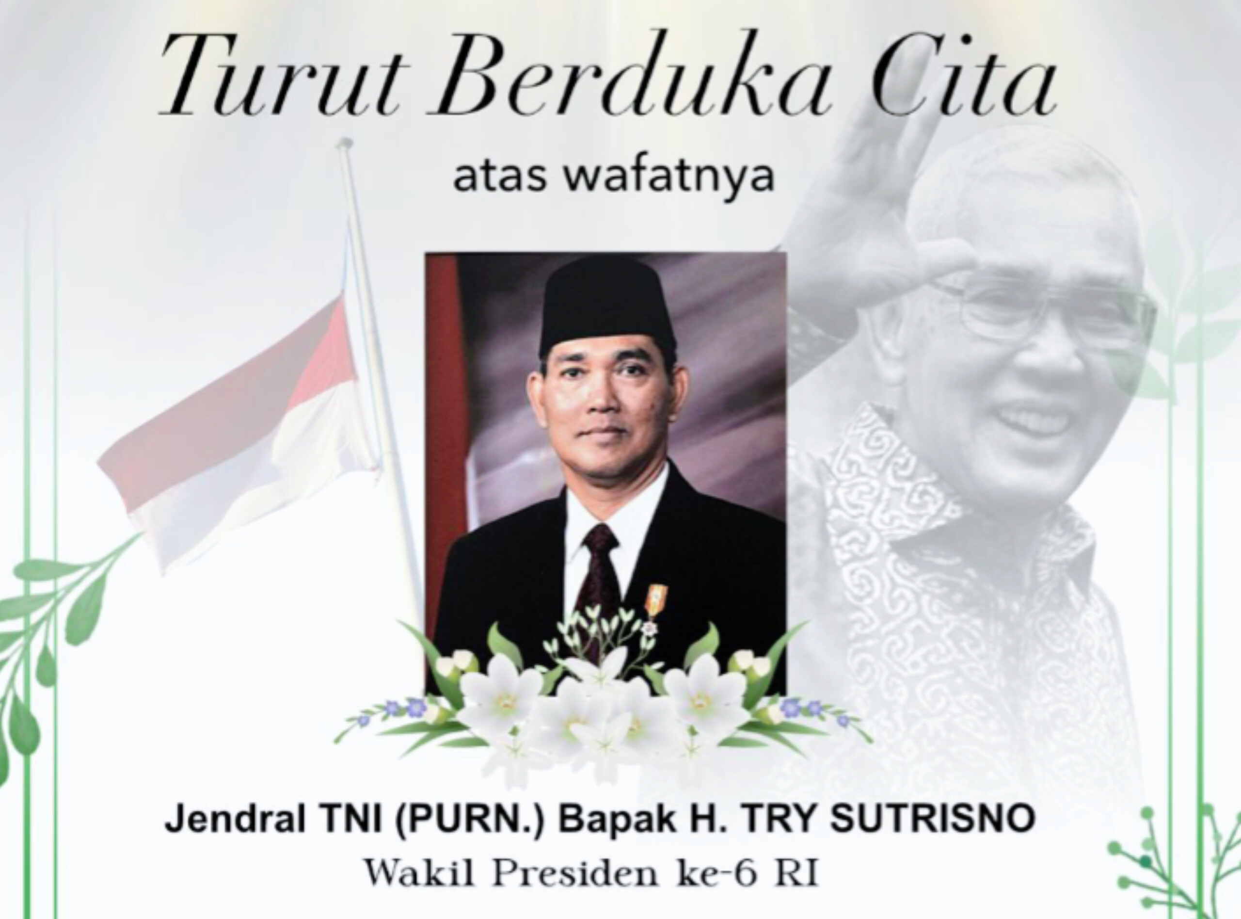 Ajakan tersebut disampaikan menyusul Surat Menteri Sekretaris Negara Republik Indonesia Nomor B-02/M/S/TU.00.00/03/2026 tanggal 2 Maret 2026 tentang Pengibaran Bendera Negara Setengah Tiang dan Hari Berkabung Nasional sebagai bentuk penghormatan atas wafatnya Try Sutrisno pada hari Senin, 1 Maret 2026, di Jakarta.